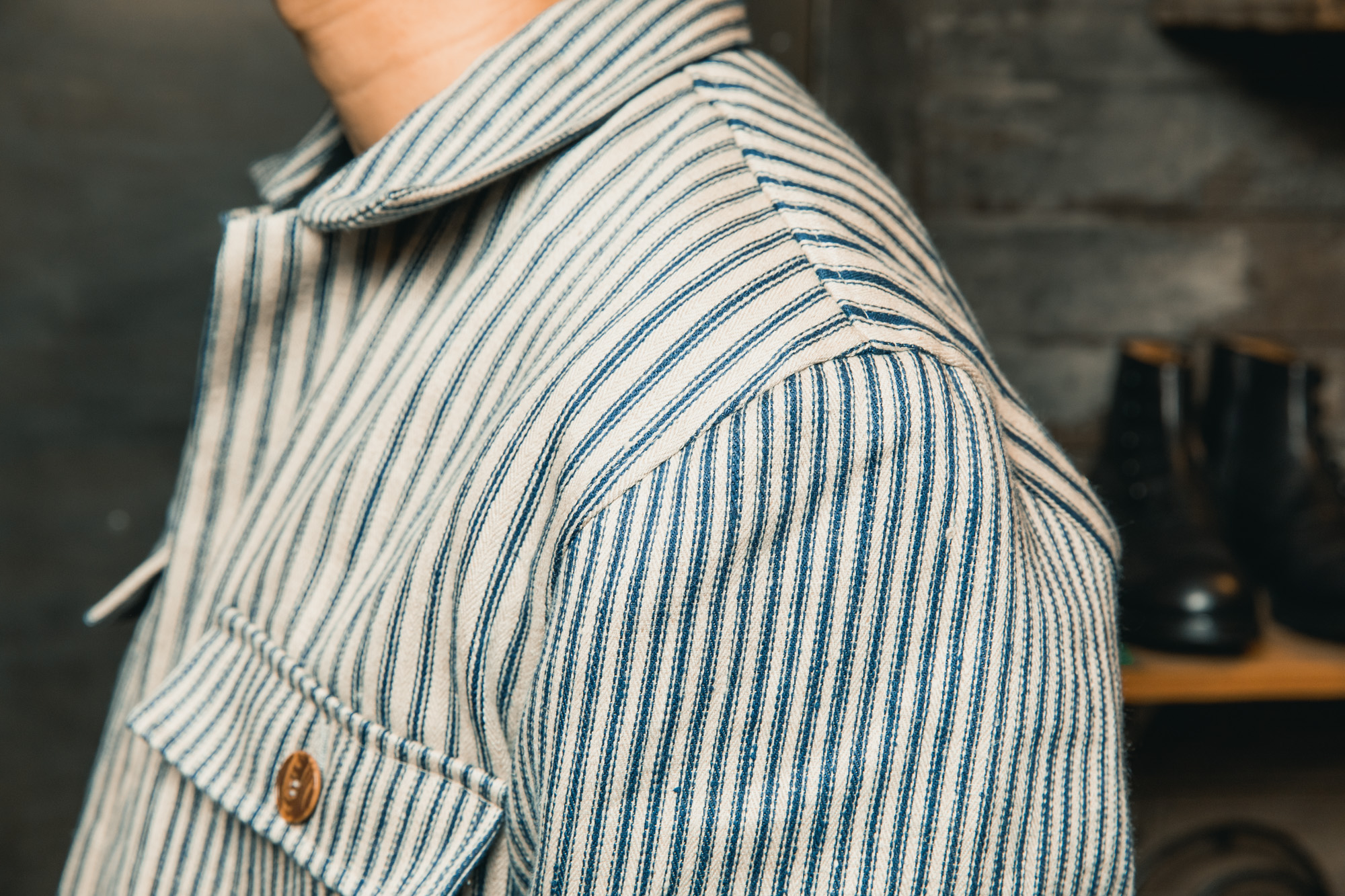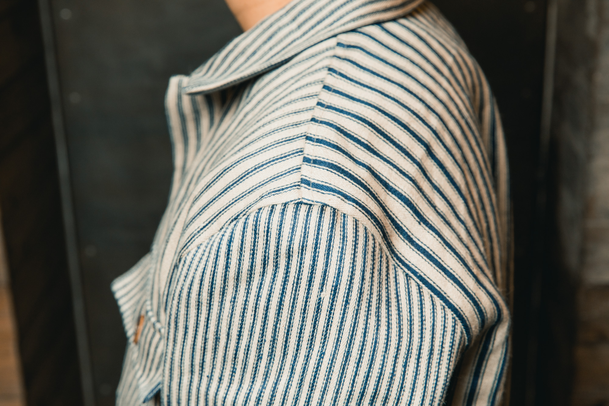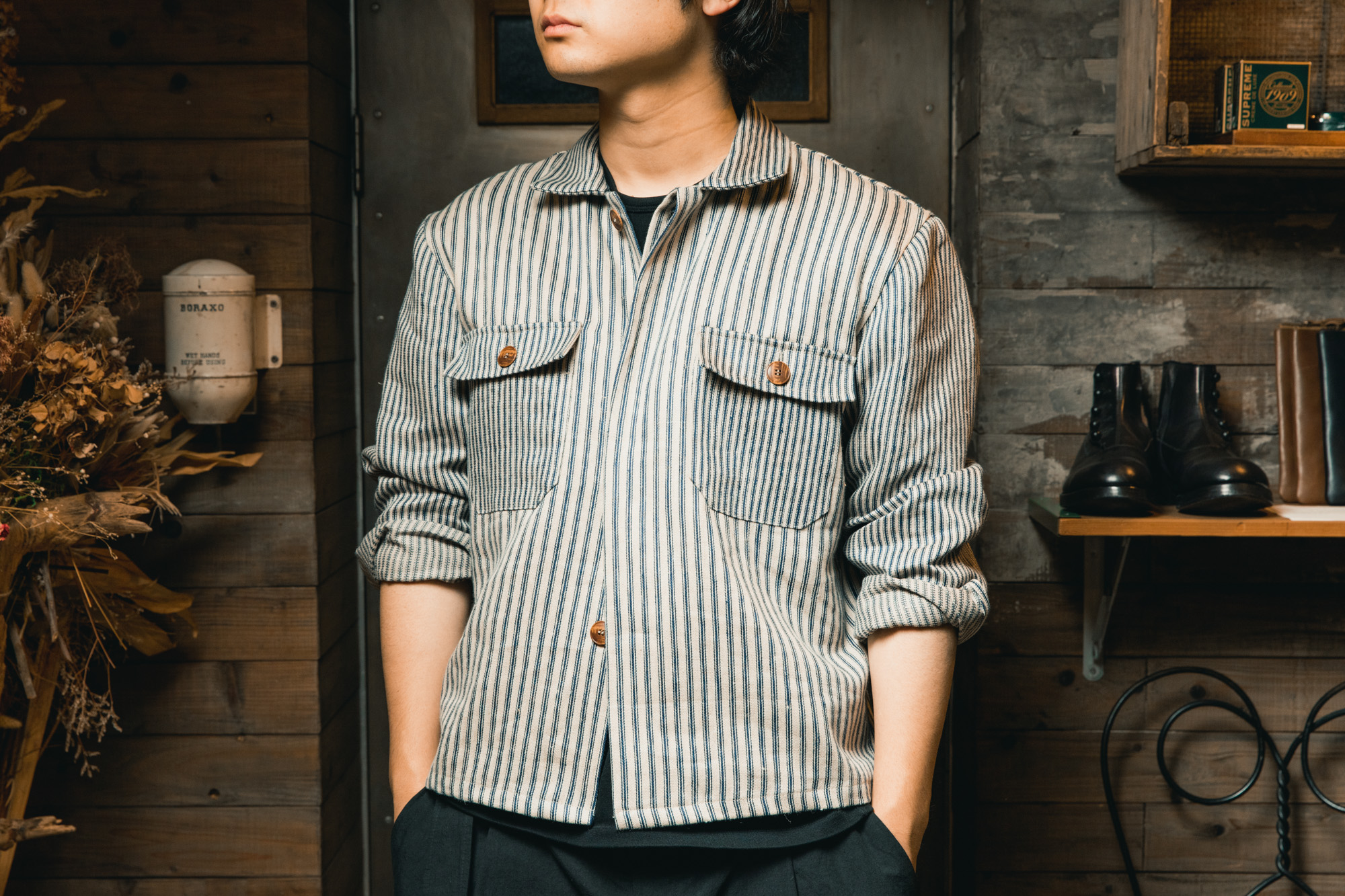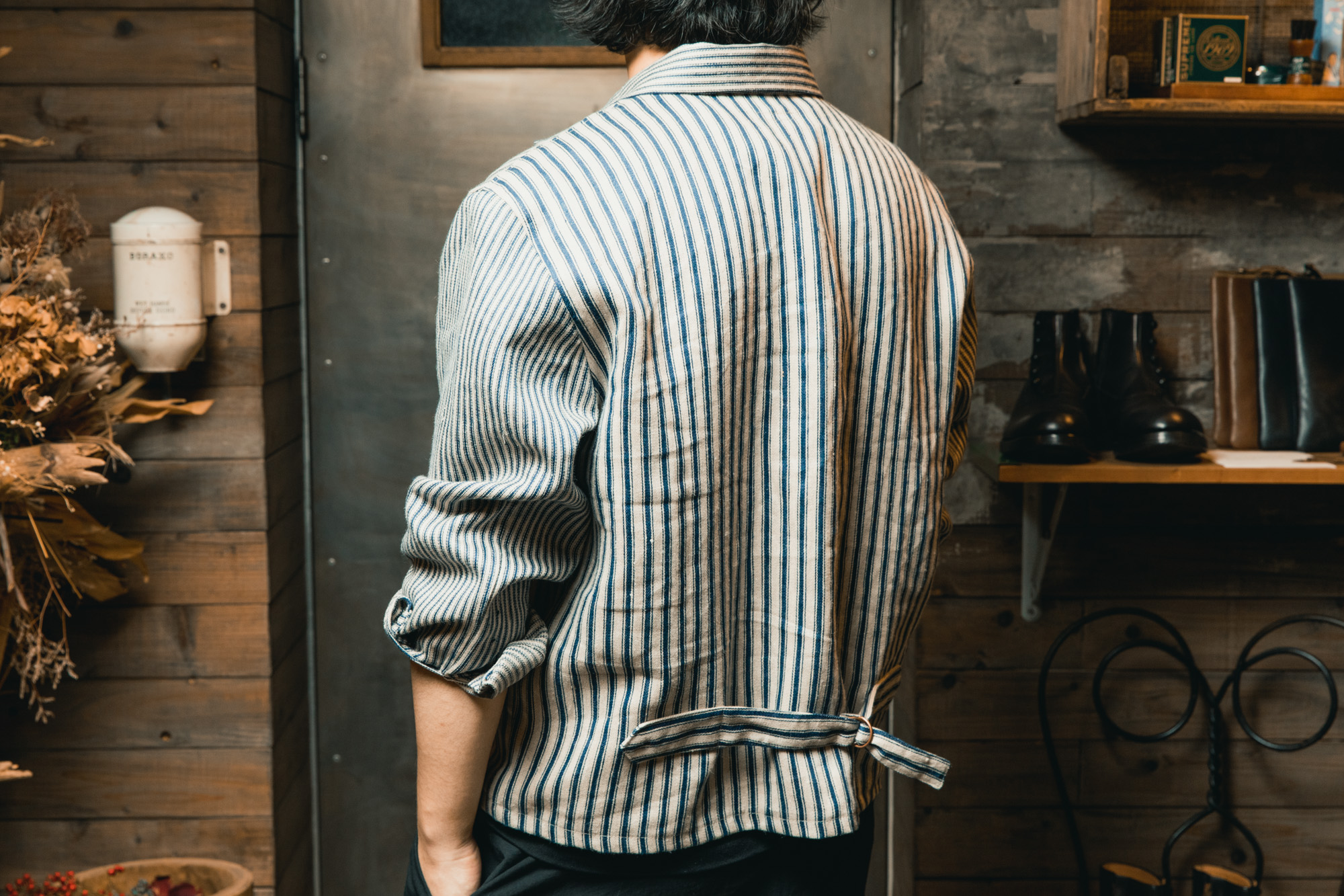 実は僕、ストライプの服を買うのはこれが初めてなんです。今まで少し敬遠していたところもあったのですが、このジャケットの「線の太さ」や「掠れたようなブルー」を見た時、スッと自分の中に馴染む感覚がありました。背中に配された「シンチバック」のディティールも、ワーク好きの心をくすぐるポイント。