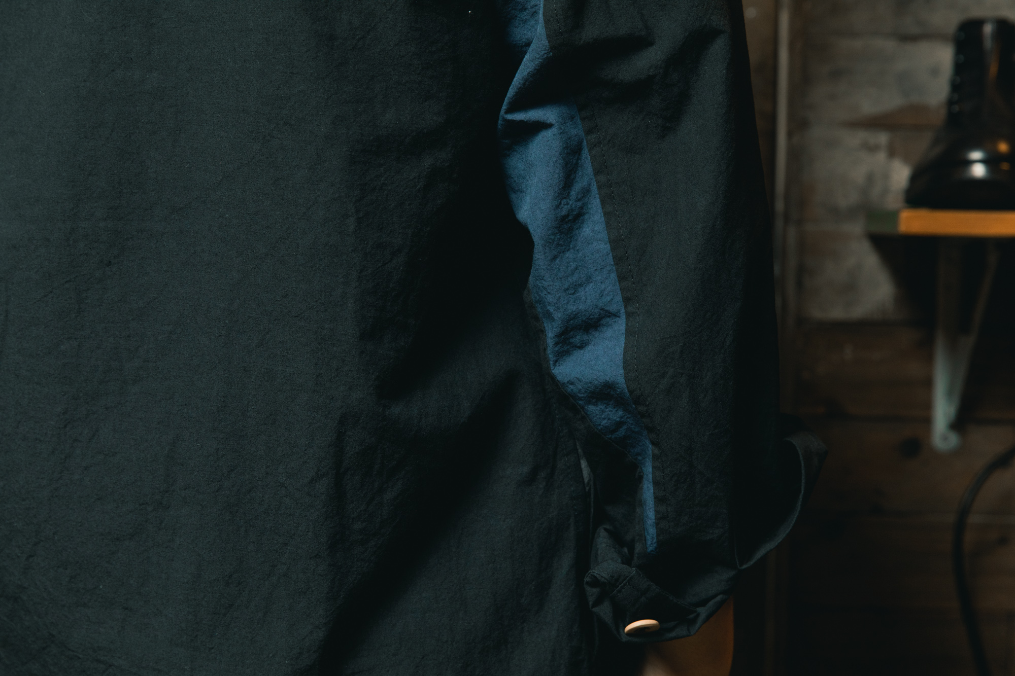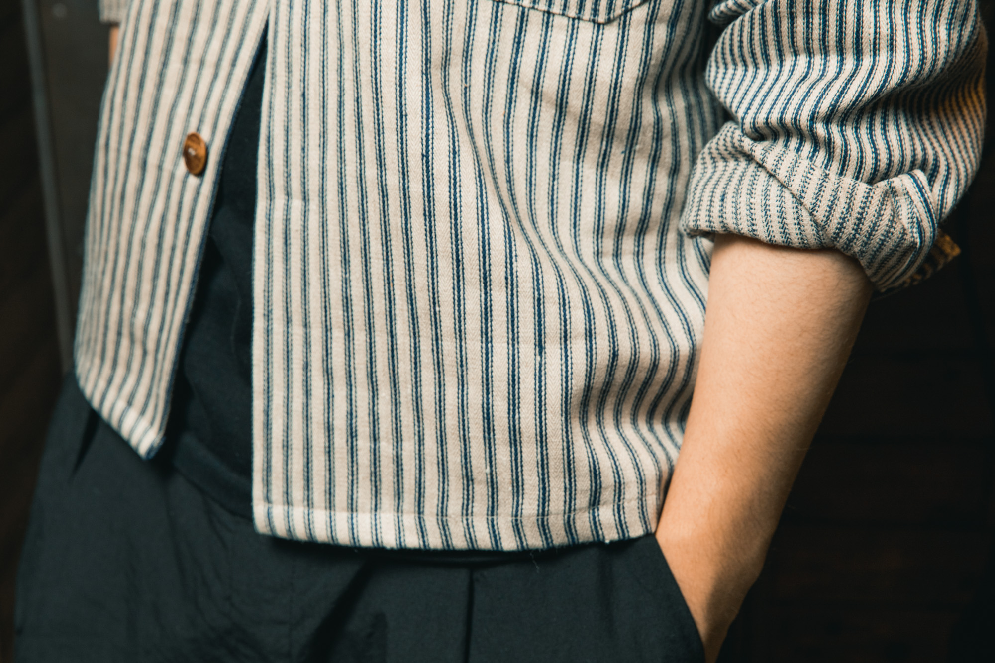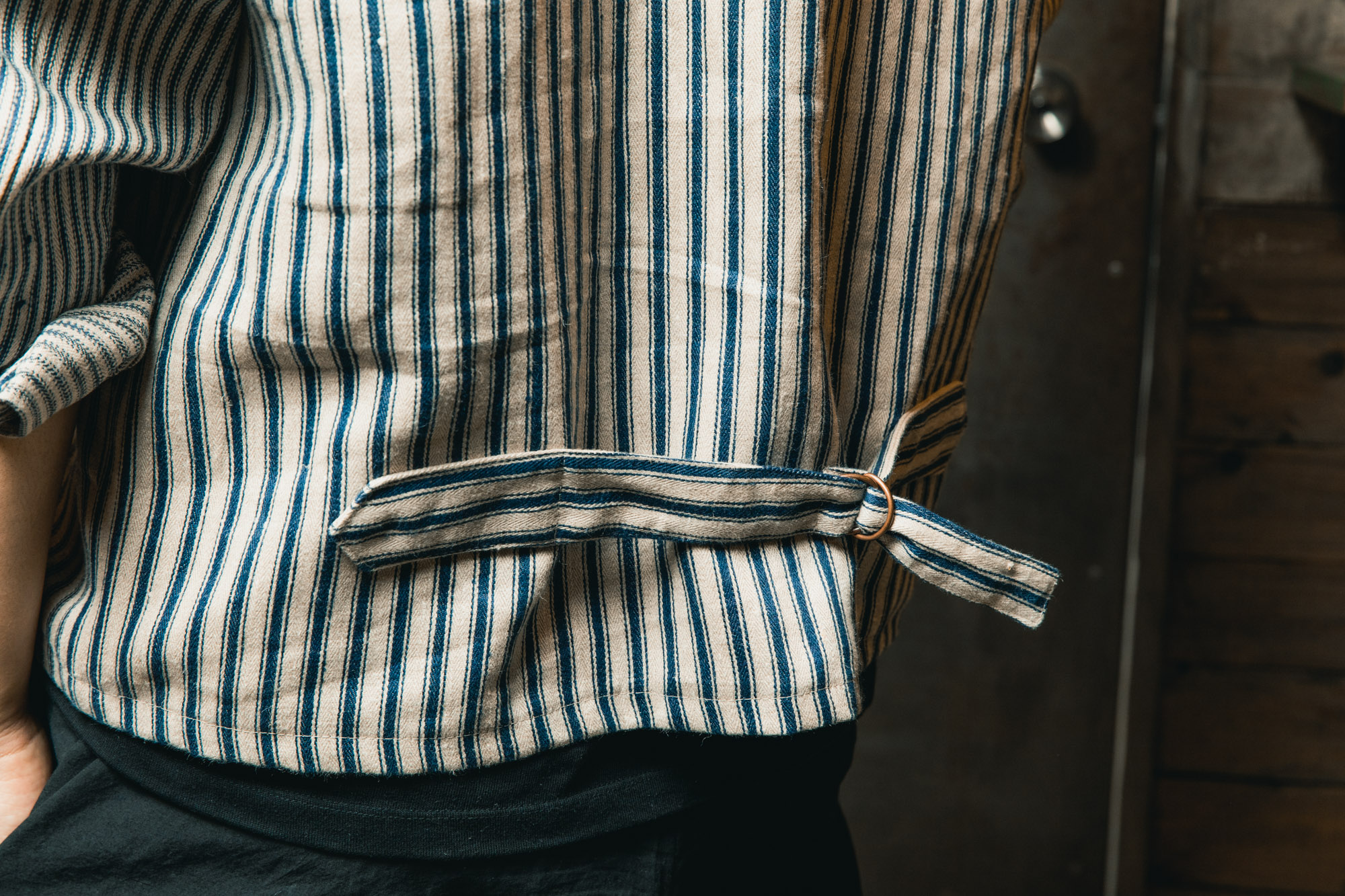 元々、僕はワーク系の服が大好きで、クローゼットにはタフな生地感のものが並んでいます。そんな僕が今回、ひと目で心を奪われたのがこの「ストライプ」でした。ストライプと言っても、どこか懐かしく、力強い。まるでヴィンテージのワークウェアで見かけるような佇まい。リネン100%でありながら、フランクリーダーらしい重厚な質感は、僕のようなワークウェア好きにはたまらない安心感があります。