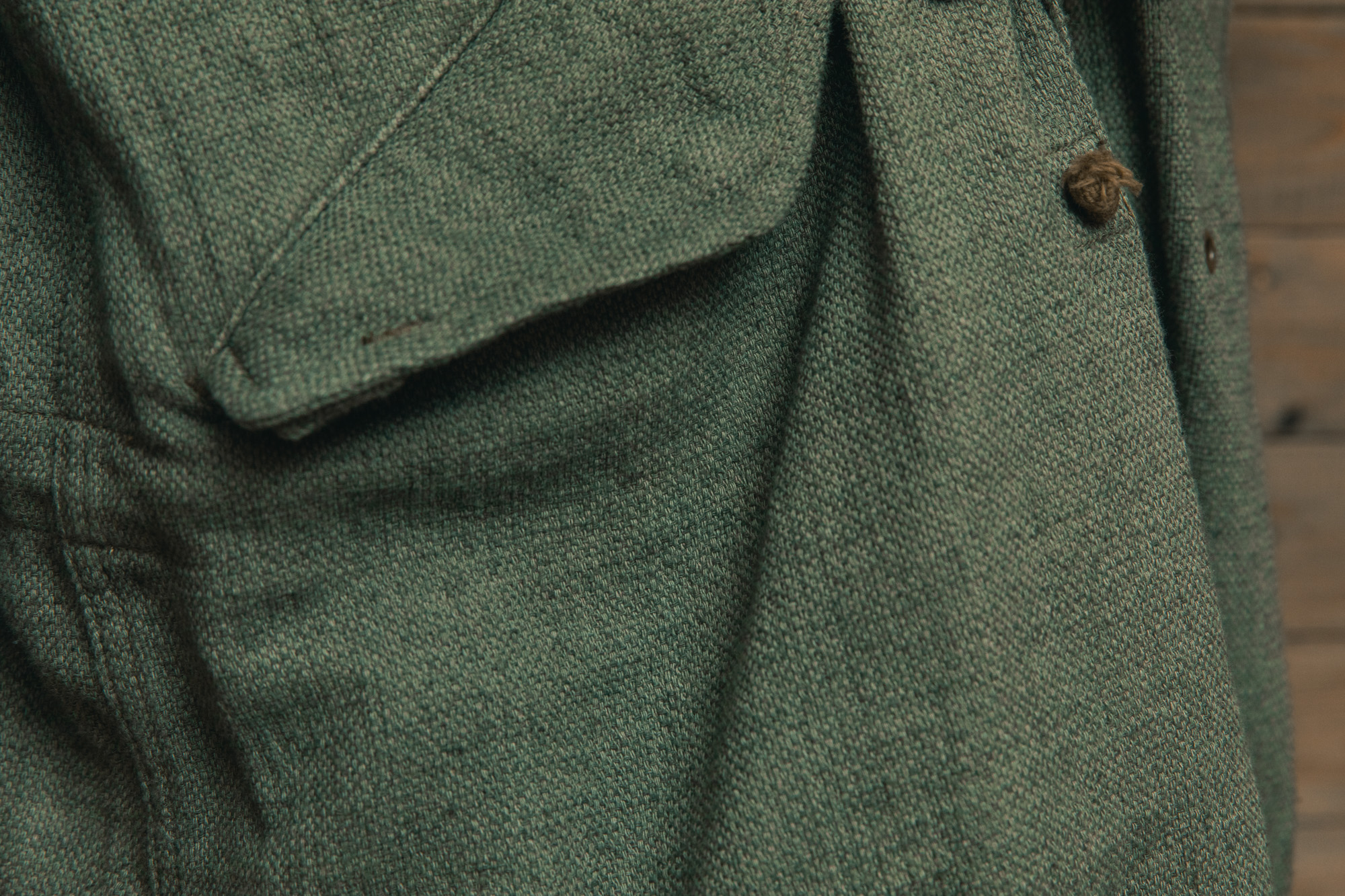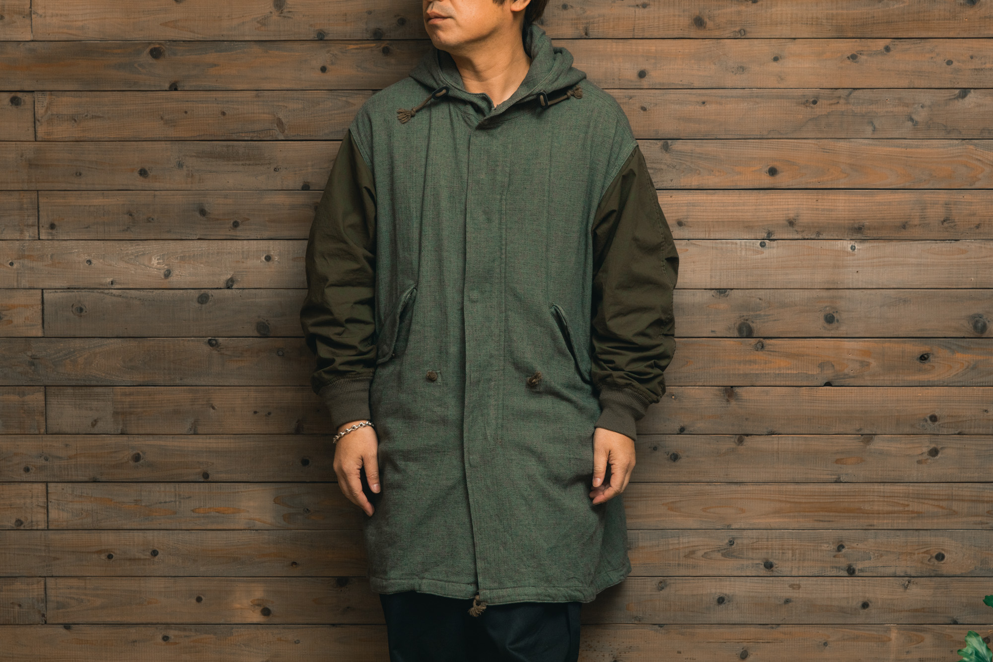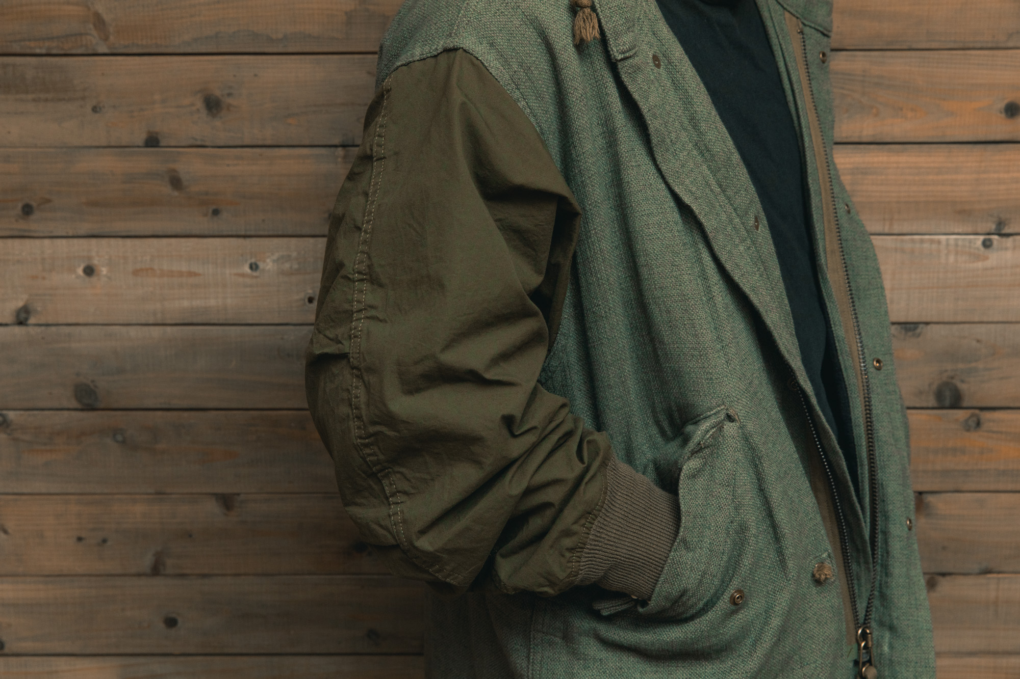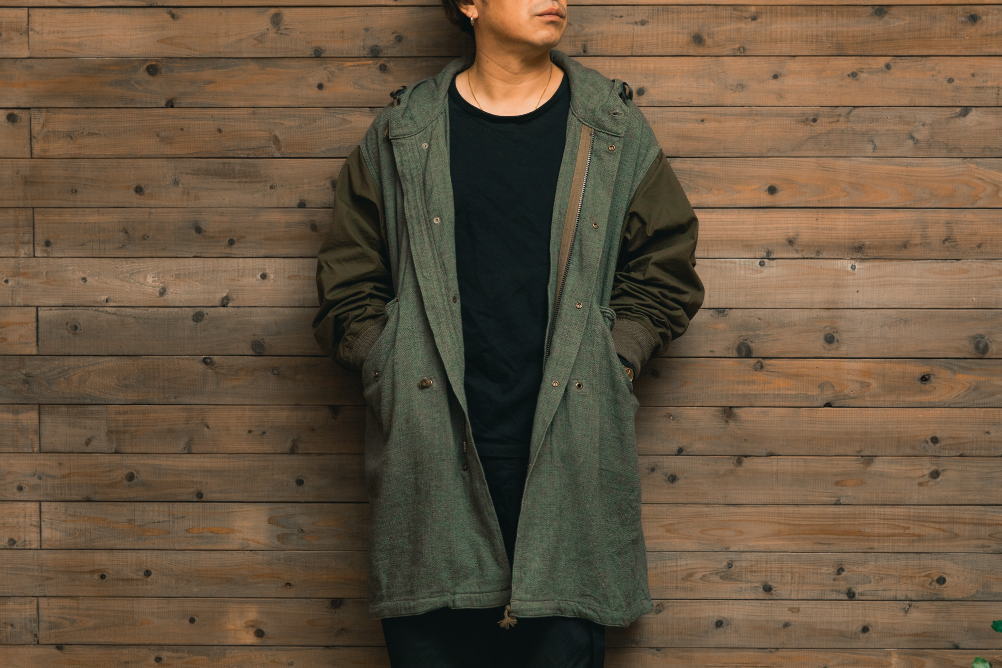 異なる2種類の素材を組み合わせることで、モッズコート特有の無骨さを程よく中和し、少し軽やかな印象に仕上がっているのもこの服の良さだと思います。裏話にはなりますが、私も生地選考の段階で実際に生地に触れたのですが、正直ここまでの仕上がりになるとは思いもよりませんでした。何十種とある1㎝四方の生地だけを見て全体をイメージする、と言えば難しさが伝わるでしょうか。結果、数多くの生地の中から採択されたこの生地はヴィンテージ特有の土臭さを残しすぎず、かといって消しすぎない。実にPainted Blankのアイテムらしい仕上がりになっています。