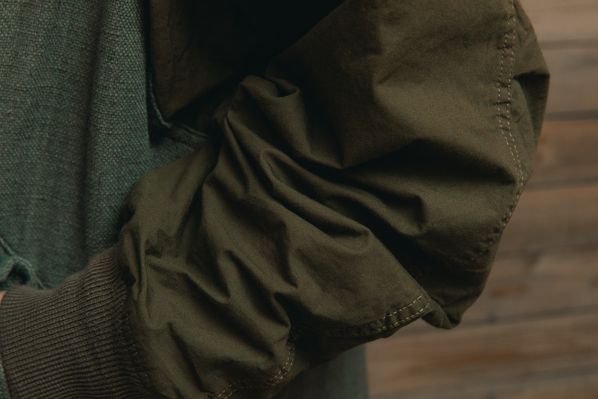 そして、このコートの特徴として挙げたいのが袖の切り替えです。パッと見で目を引く方も多いのではないでしょうか。これはオランダ軍のミリタリーライナーに見られるディテールが取り入れられており、ボディとは異なる超高密度のコットンウェザーを使用しています。通常のウェザー生地であれば光沢を出す仕上げをすることが多いのですが、今回はあえてそういった加工は施さず、生地本来の素朴な質感を残しています。高密度ながらも硬すぎず、袖をまくった際も自然なドレープが出る生地となっています。