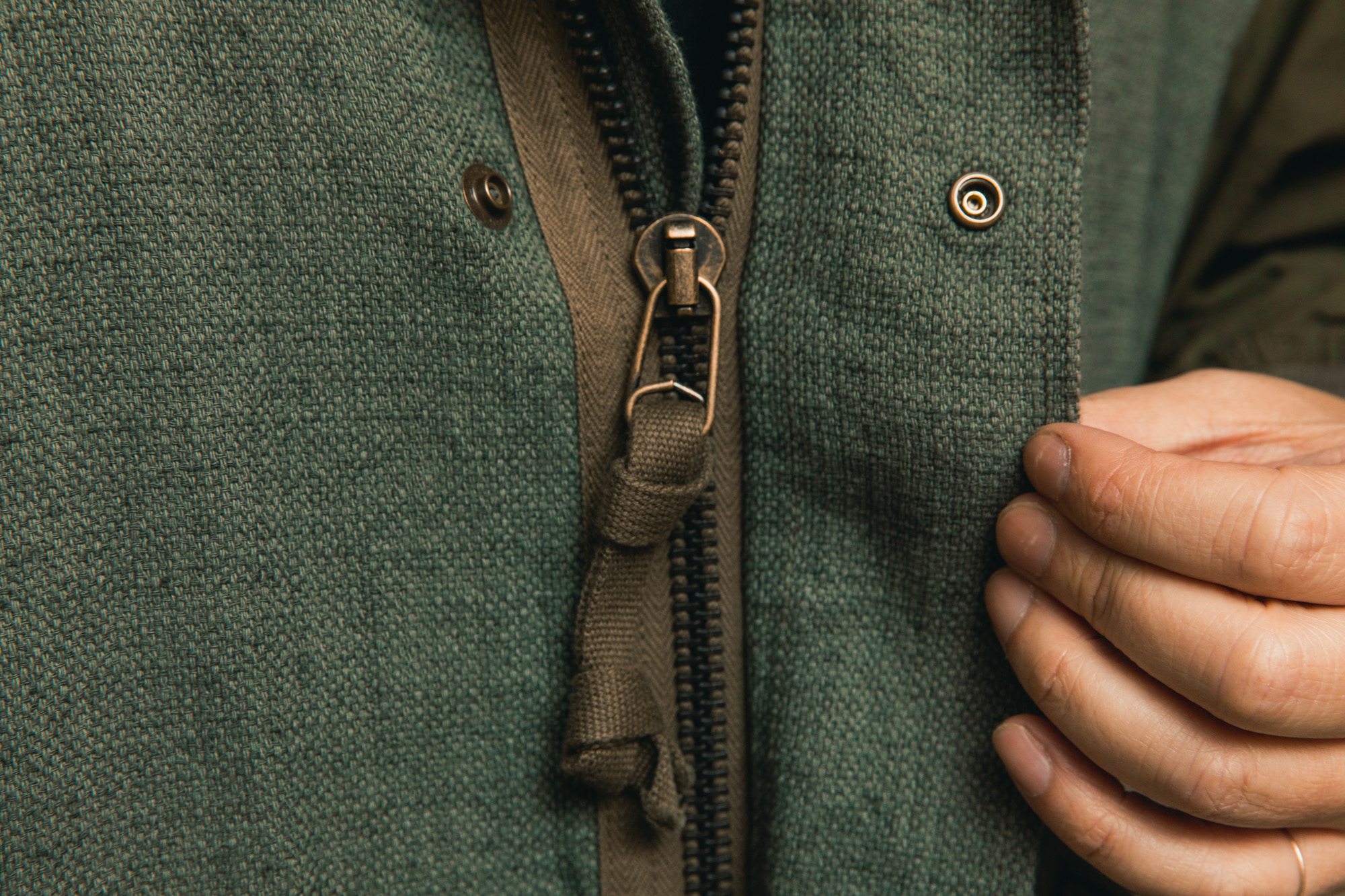 まず素材ですが、ボディには手織りのコットンリネンを使用しています。機械ではなく人の手によって織られた生地は、均一すぎない柔らかな表情を持ち、着た時にどこか空気を含んだような質感があります。